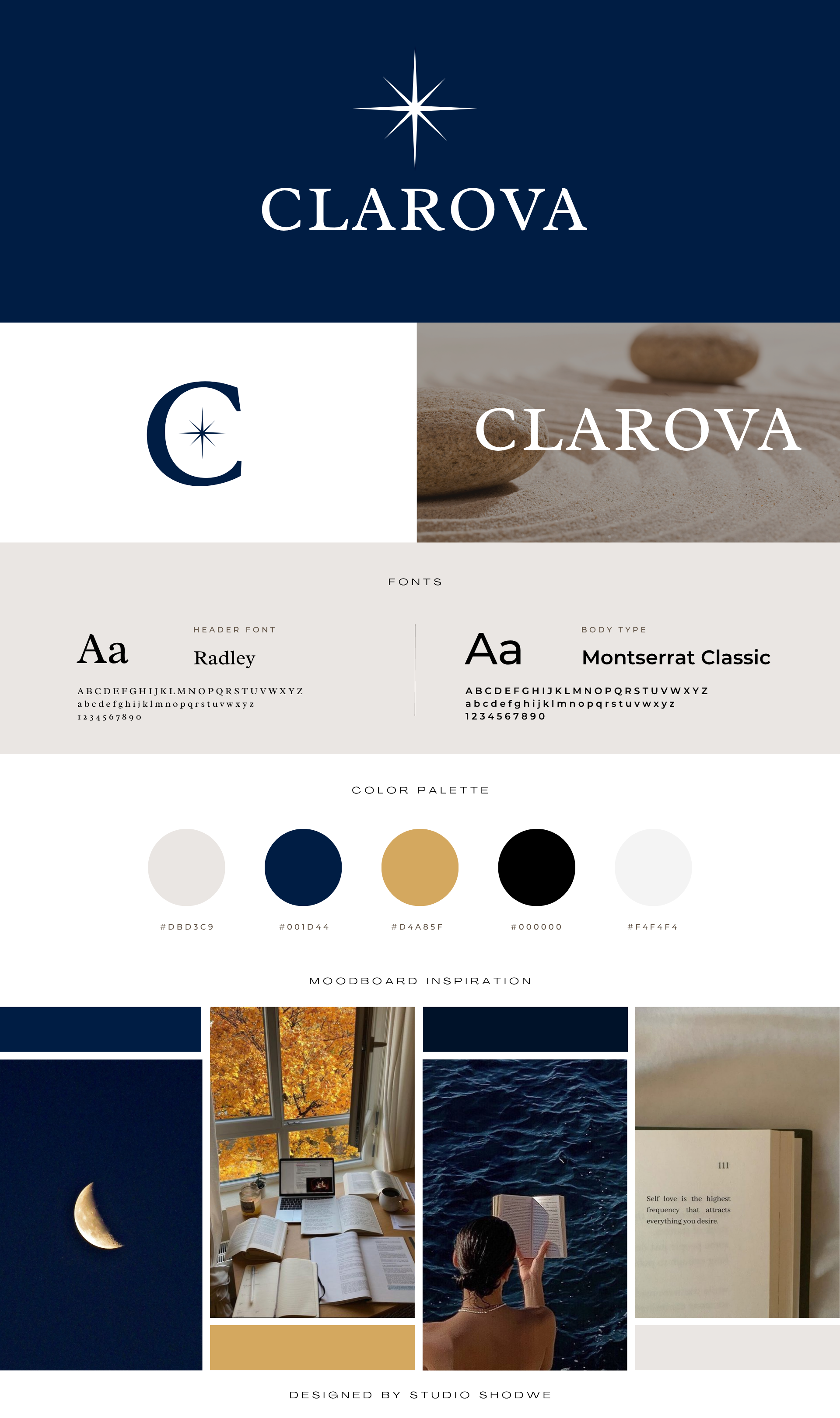 A timeless identity for a personal-development brand. The star emblem represents guidance and reinvention: aligning with Clarova’s message of finding direction and clarity in life.